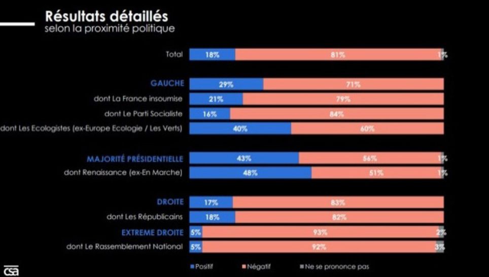 Makronun təhlükəsizlik siyasəti sağçı, solçu partiyaların tərəfdarları tərəfindən də tənqid olunur. Makronçu “Renaissance” partiyasının tərəfdarlarının 51 faizi onun bu sahədəki fəaliyyətini mənfi qiymətləndirir. Yaşılların (Écologistes) tərəfdarları nisbətən az tənqidi olsa da, yenə də 60 faizi narazıdır. “Əyilməz Fransa” (LFİ) partiyasının seçiciləri arasında bu göstərici 79 faiz, sosialist partiyası tərəfdarları arasında isə 84 faizdir. Milli Birlik Partiyası (RN) tərəfdarları arasında isə rəqəm 92 faizə çatır.