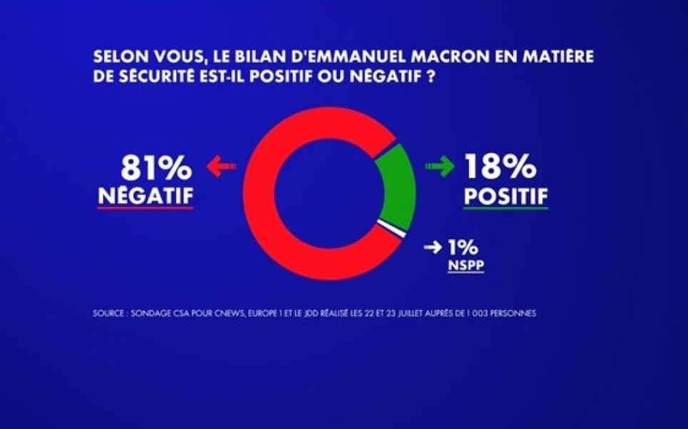 AZƏRTAC xəbər verir ki, CSA İnstitutunun “CNEWS”, “Europe 1” televiziya kanalları və JDD qəzeti üçün keçirdiyi sorğuya əsasən, fransızların 81 faizi Makronun təhlükəsizlik siyasətini uğursuz hesab edir. Bu göstərici ötən il 76 faiz, 2022-ci ilin fevralında isə 62 faiz idi. Bu sorğu, narazılığın ildən-ilə artdığını göstərir.