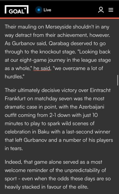 Yazıda vurğulanıb ki, VII turda Almaniyanın “Ayntraxt” klubuna qarşı qazanılan həlledici qələbə bunun ən dramatik nümunəsi oldu: “Qarabağ” matçın bitməsinə 10 dəqiqə qalmış 1:2 hesabı ilə geri düşdüyü halda, son saniyələrdə vurulan qələbə qolu Bakıda böyük sevincə səbəb oldu. Həmin anlarda Qurban Qurbanov və bir sıra futbolçular göz yaşlarını saxlaya bilmədilər. Məhz bu qarşılaşma idmanda gözlənilməzliyin həmişə mövcud olduğunu və favoritlərin şansı nə qədər yüksək olsa da, sürprizlərin qaçılmazlığını göstərdi”.