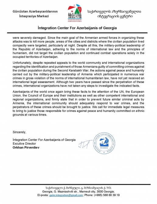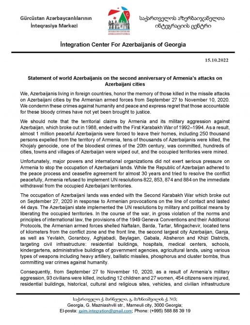 Diasporla İş üzrə Dövlət Komitəsindən AZƏRTAC-a verilən məlumata görə, GAİM-in icraçı direktoru Orxan Pirverdiyevin adından beynəlxalq təşkilatların Tbilisidəki nümayəndəliklərinə ünvanlanan müraciətdə bildirilib ki, bu günlərdə Gürcüstan azərbaycanlıları 2020-ci il sentyabrın 27-dən noyabrın 10-dək Ermənistan silahlı qüvvələrinin Azərbaycan şəhərlərinə raket hücumları nəticəsində həlak olanların xatirəsini ehtiramla yad edirlər. Ermənistanın həmin müddət ərzində törətdiyi hərbi təcavüz nəticəsində 12-si uşaq, 27-si qadın olmaqla 93 mülki şəxsin həlak olduğuna, 454 nəfərin müxtəlif dərəcəli bədən xəsarətləri aldığına, mülki infrastruktura ciddi ziyan dəydiyinə diqqət cəlb edilib.