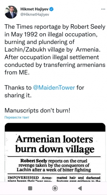 AZƏRTAC paylaşımı təqdim edir: “Robert Silinin 1992-ci ilin mayında Laçının Zabux kəndinin Ermənistan tərəfindən qanunsuz işğalı, yandırılması və talan edilməsi haqqında “Times” qəzetində reportajı. İşğaldan sonra ermənilərin Yaxın Şərqdən köçürülməsi yolu ilə qanunsuz məskunlaşddırılması aparılıb. Əlyazmalar yanmır”.