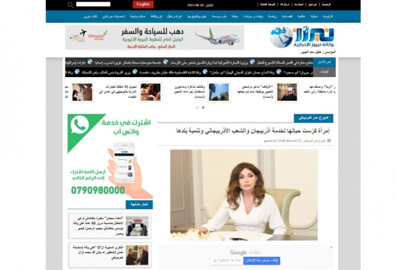 Tanınmış iordaniyalı tarixçi və jurnalist Ömər Armuti İordaniyanın “Nayrouz” informasiya agentliyinin saytında Azərbaycanın birinci xanımı Mehriban Əliyeva haqqında geniş məqalə ilə çıxış edib.