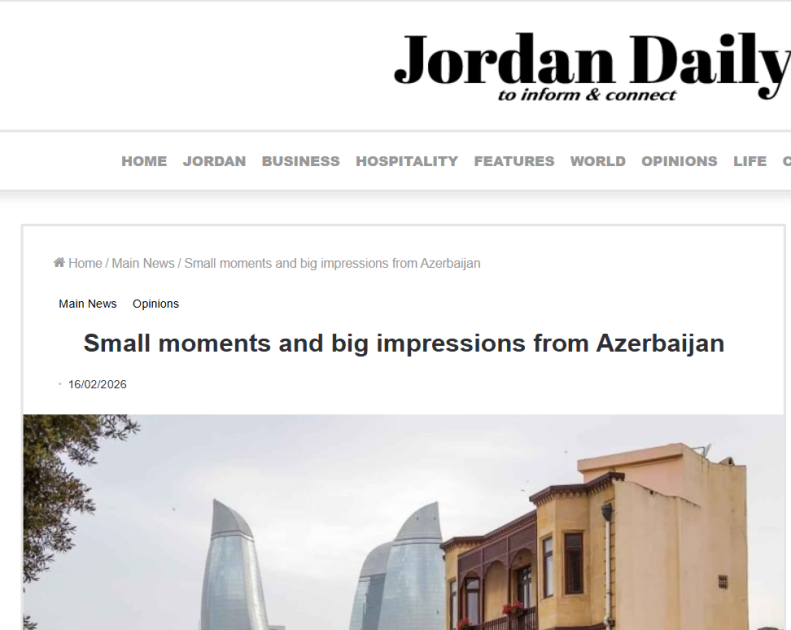 Azərbaycanda səfərdə olmuş iordaniyalı jurnalist Nidal Zubeydi öz təəssüratlarını "Jordan Daily" qəzetində yayımlanan məqalələrində oxucularla bölüşüb.