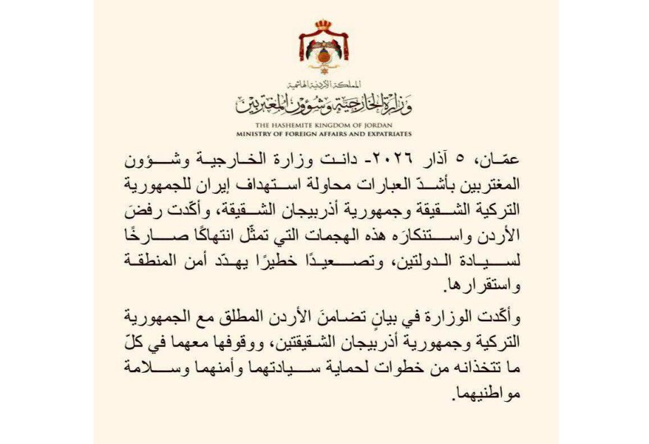 İordaniya Haşimilər Krallığı Türkiyə və Azərbaycanın İran tərəfindən hədəfə alınmasını ən sərt ifadələrlə pisləyib.