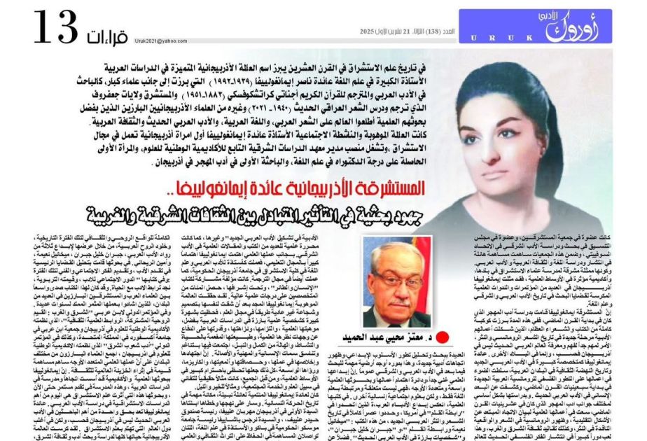 İraqın Mədəniyyət, Turizm və Abidələr Nazirliyinin mətbu orqanı olan “Uruk” qəzetində görkəmli şərqşünas, filologiya elmləri doktoru, professor Aida İmanquliyeva haqqında məqalə dərc edilib.
