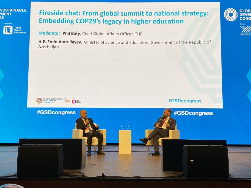 “Times Higher Education” reytinq agentliyinin qlobal məsələlər üzrə baş direktoru Fil Batinin moderatorluğu ilə “Qlobal sammitdən milli strategiyaya – COP29 prinsiplərinin ali təhsildə tətbiqi” mövzusunda baş tutan paneldə əsas çıxışçı qismində iştirak edən nazir ali təhsil müəssisələrimizin fəaliyyətində dayanıqlı inkişafın təşviqi istiqamətində görülən işlər barədə danışaraq iqlim dəyişikliyi ilə mübarizədə keyfiyyətli təhsilin bütün səviyyələrə inteqrasiyasının böyük əhəmiyyət daşıdığını vurğulayıb.
