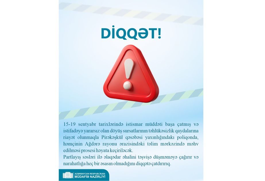 İstismar müddəti başa çatmış və istifadəyə yararsız olan döyüş sursatlarının təhlükəsizlik qaydalarına riayət olunmaqla 15-19 sentyabr tarixlərində Pirəkəşkül qəsəbəsi yaxınlığındakı poliqonda, həmçinin Ağdərə rayonu ərazisindəki təlim mərkəzində məhv edilməsi prosesi həyata keçiriləcək.