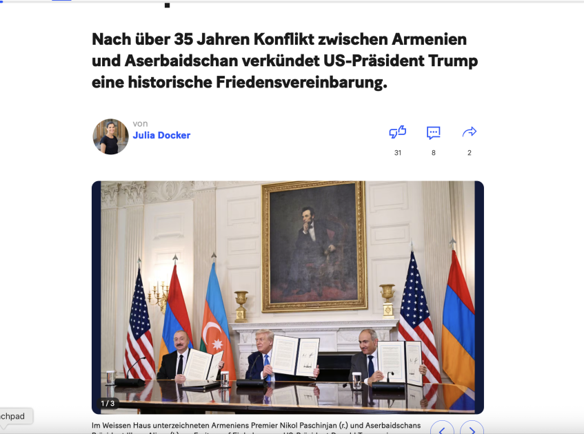 “Neue Zürcher Zeitung“ yazır ki, bununla da Cənubi Qafqazda sülhə doğru daha bir mühüm addım atılıb. ABŞ-da əldə edilən razılaşmaların tərkibinə Donald Trampın adını daşıyacaq və blokada altında olan sərhədləri açmalı olan nəqliyyat marşrutu daxildir.