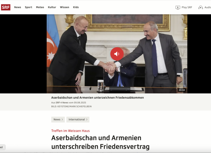 AZƏRTAC xəbər verir ki, İsveçrə Teleradiosu (SRF), həmçinin “Neue Zürcher Zeitung“, “Blick“, “Tagesanzeiger“, “20 Minuten“, “Le Temp“ kimi aparıcı gündəlik qəzetlər onillərdən bəri davam edən bir münaqişədə ciddi irəliləyiş əldə olunduğunu bildirirlər. Diqqətə çatdırılıb ki, cümə günü Ağ evdə bir araya gələn Azərbaycan və Ermənistan liderləri sülh razılaşması yolunda mühüm əhəmiyyətə malik Birgə Bəyannaməyə imza atıblar.