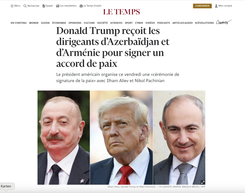 İsveçrə mediasının da diqqəti ABŞ Prezidenti Donald Trampın vasitəçiliyi ilə Azərbaycan Prezidenti İlham Əliyev və Ermənistanın Baş naziri Nikol Paşinyan arasında keçirilən Sülh Sammiti və imzalanan razılaşmalara yönəlib.