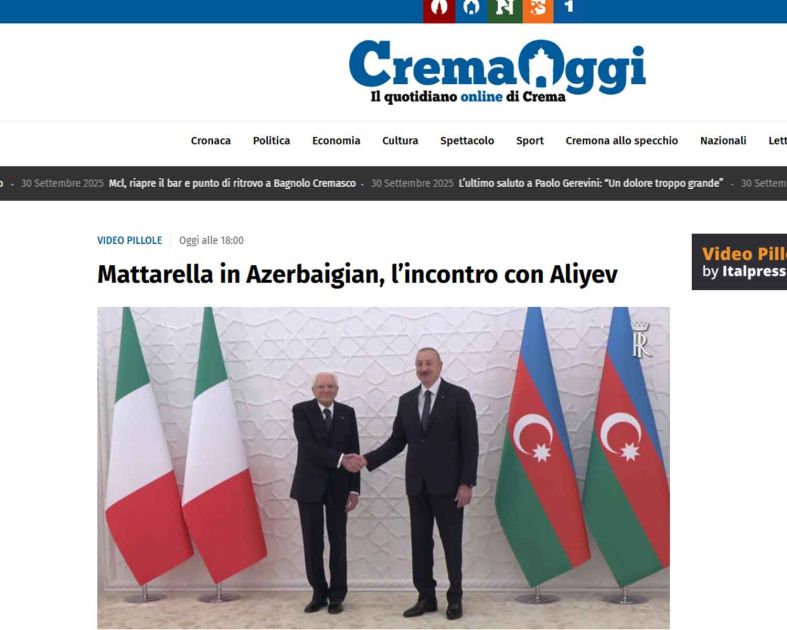 AZƏRTAC xəbər verir ki, “RAI”, “Adnkronos”, “Italpress”, “Askanews”, “Il Sole 24 Ore”, “Borsa Italiana”, “La Gazzetta del Mezzogiorno”, “Virgilio”, “Cremaoggi” kimi informasiya agentlikləri və xəbər portallarının yaydığı materiallarda Bakıda Azərbaycan Prezidenti İlham Əliyev tərəfindən Sercio Mattarella üçün rəsmi qarşılanma mərasiminin keçirildiyi, iki ölkə prezidentlərinin təkbətək və geniş tərkibdə görüşlərinin olduğu, mətbuata bəyanatlarla çıxış etdikləri bildirilir.