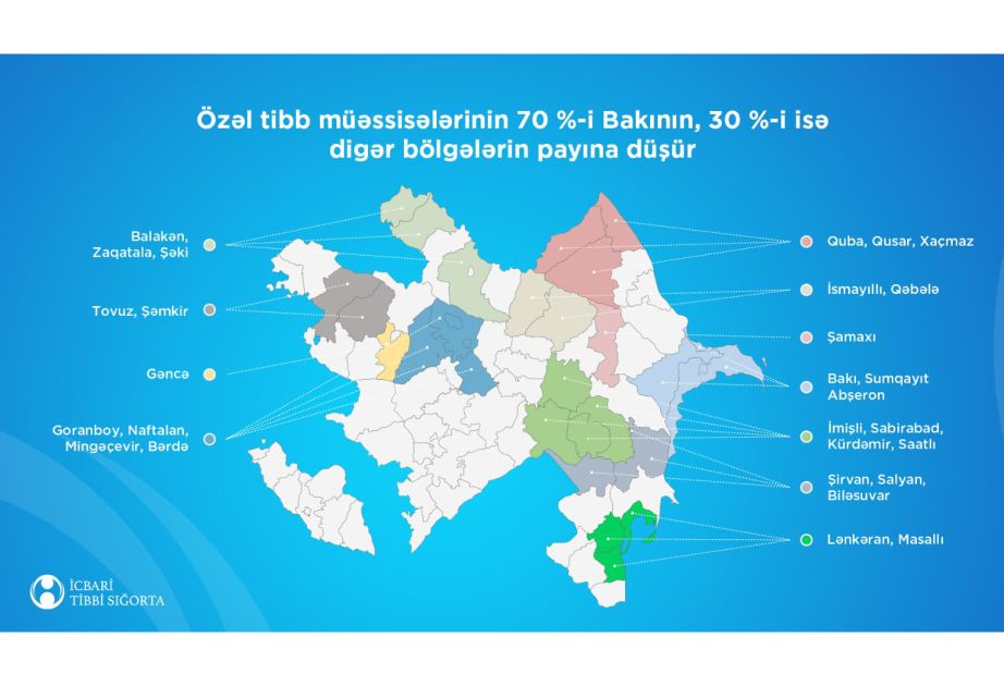 Bildirilib ki, özəl tibb müəssisələrinin fəaliyyət göstərdiyi şəhər və rayonlar sırasında Bakı, Gəncə və Sumqayıt ilə yanaşı, Abşeron, Quba, Qusar, Xaçmaz, İsmayıllı, Şamaxı, Qəbələ, Şəki, Zaqatala, Balakən, Naftalan, Goranboy, Şəmkir, Tovuz, Mingəçevir, Bərdə, Kürdəmir, Sabirabad, İmişli, Saatlı, Şirvan, Salyan, Biləsuvar, Masallı və Lənkəran da var.