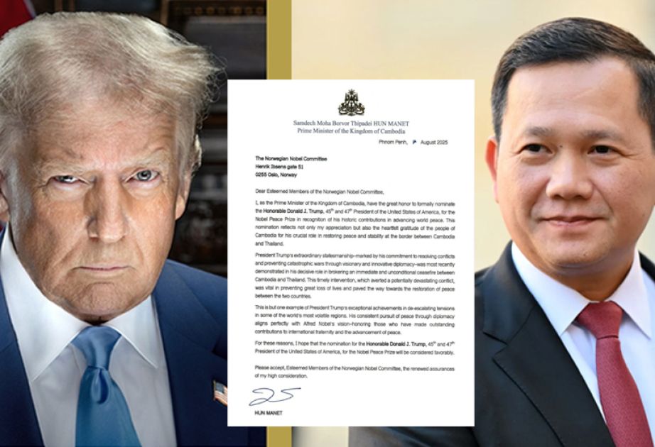 Kambocanın Baş naziri Hun Manet tərəfindən göndərilən məktubda deyilir ki, Trampın namizədliyi onun dünyada sülhün möhkəmlənməsinə verdiyi tarixi töhfə ilə əlaqədardır. O yazıb: “Potensial dağıdıcı münaqişənin qarşısını alan həmin müdaxilə böyük insan tələfatının qarşısının alınmasında mühüm rol oynadı və iki ölkə arasında sülhün bərpasına zəmin yaratdı”.