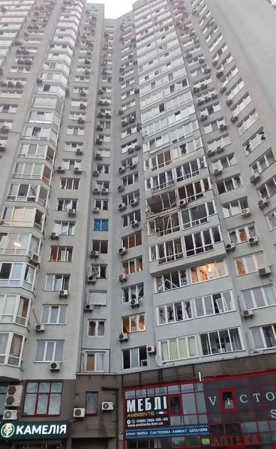 Kiyev şəhər Hərbi Administrasiyasının rəhbəri Timur Tkaçenkonun yaydığı məlumata görə, Ukraynanın paytaxtında zərər görmüş yerlərdən biri Darnitski rayonundakı 25 mərtəbəli yaşayış binasıdır. Hücum nəticəsində binanın pəncərələri dağılıb, girişlərdən birində 3-cü mərtəbədən 11-ci mərtəbəyə qədər olan eyvanların şüşələri sınıb. Binanın həyətinə və orada dayanan avtomobillərə də ziyan dəyib.