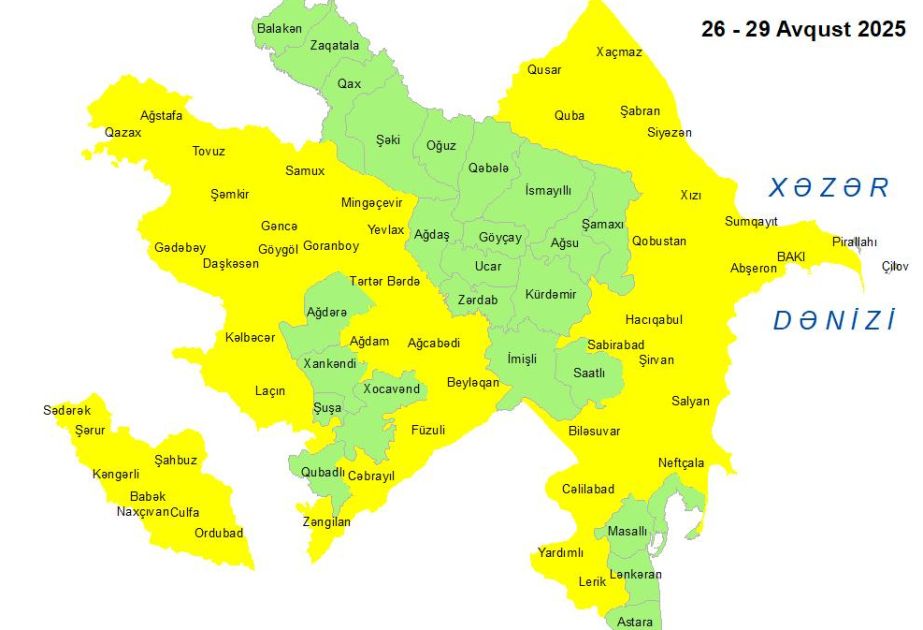 Milli Hidrometeorologiya Xidməti avqustun 26-dan 29-dək Bakıda və Abşeron yarımadasında, eyni zamanda, bəzi bölgələrdə gözlənilən küləkli hava şəraiti ilə bağlı sarı xəbərdarlıq verib.