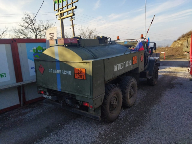 Rusiya sülhməramlılarına məxsus avtomobillər Laçın-Xankəndi yolunda dinc aksiya keçirilən ərazidən maneəsiz hərəkət edir.