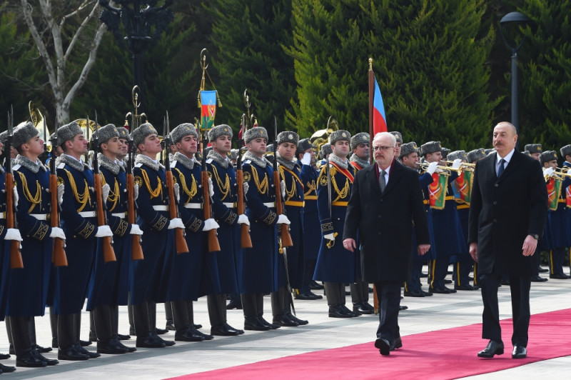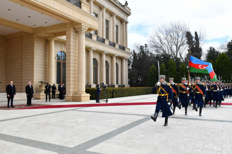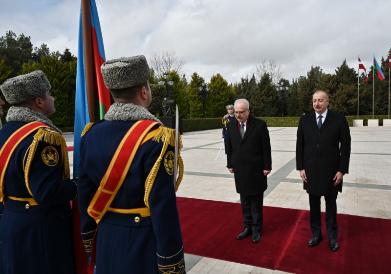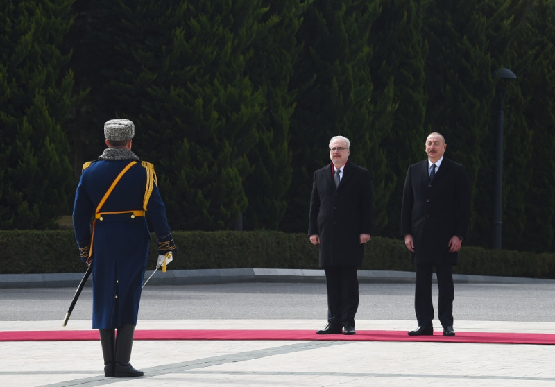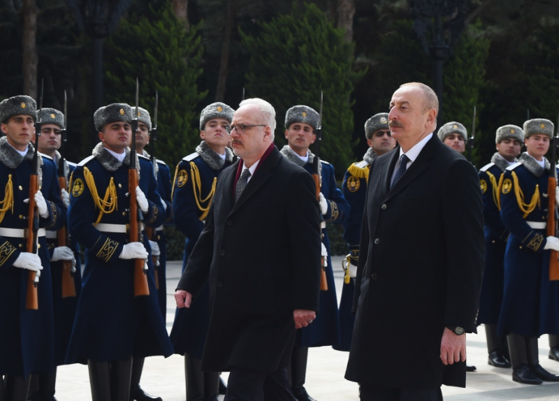 Fəxri qarovul dəstəsi hərbi marşın sədaları altında Azərbaycan Prezidenti İlham Əliyevin və Latviya Prezidenti Egils Levitsin qarşısından keçdi.