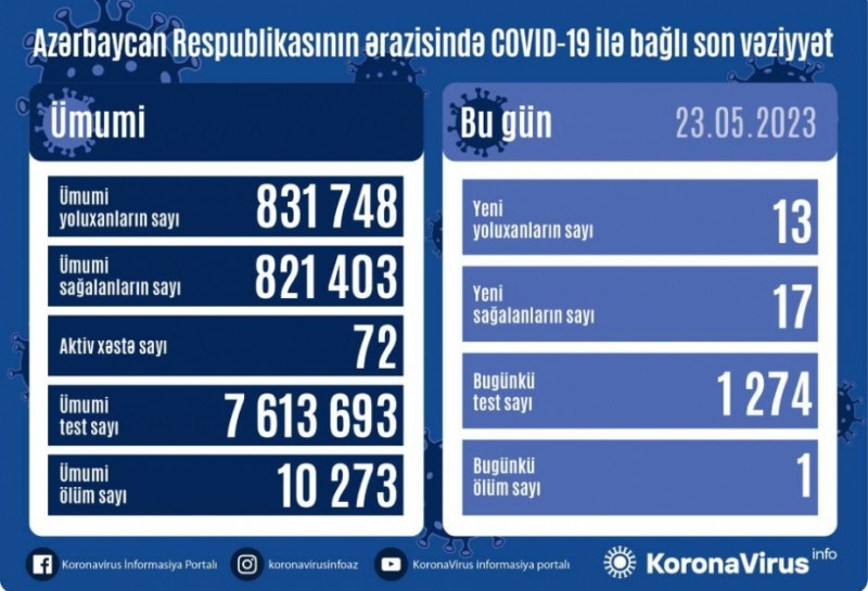 Mayın 23-də Azərbaycanda COVID-19 infeksiyasına 13 yoluxma faktı qeydə alınıb