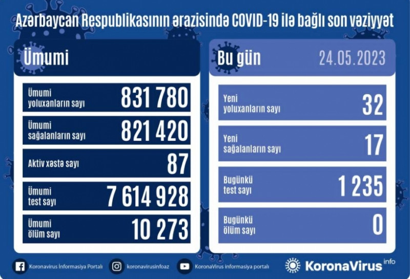 Mayın 24-də Azərbaycanda COVID-19 infeksiyasına 32 yoluxma faktı qeydə alınıb