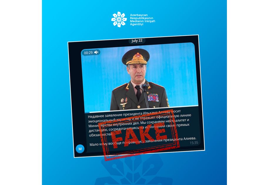 AZƏRTAC açıqlamanı təqdim edir: “Bir sıra sosial şəbəkə hesablarında Azərbaycan Respublikasının daxili işlər naziri adından Azərbaycan Respublikası Prezidentinin açıqlamalarına dair həqiqətə uyğun olmayan saxta şərh yayılıb.