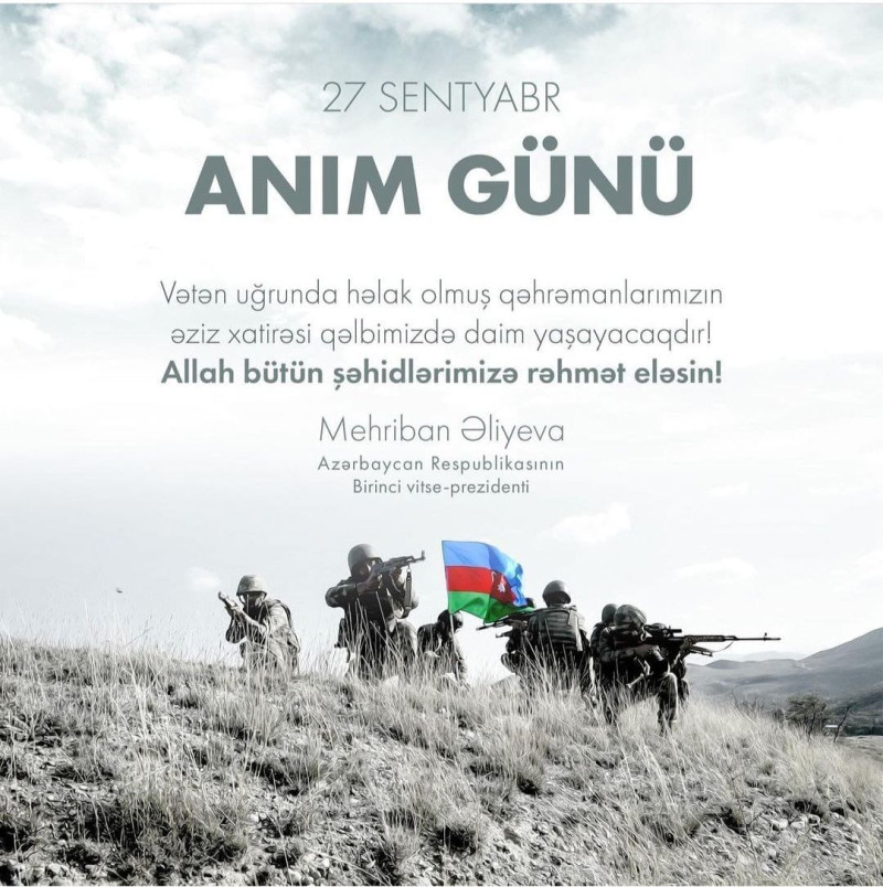 Azərbaycan Respublikasının Birinci vitse-prezidenti Mehriban Əliyeva rəsmi instaqram hesabında 27 Sentyabr - Anım Günü ilə əlaqədar paylaşım edib.