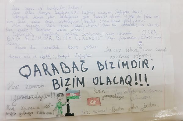 Amma məktəblilər yalnız cəbhəyə yardım göstərməklə kifayətlənmirdilər, bununla borclarını bitmiş hesab etmirdilər. Onlar həm də İkinci Qarabağ müharibəsində yurdumuzun azadlığı uğrunda vuruşan zabit və əsgərlərimizin döyüş ruhunu daha da yüksəltmək üçün, vətənpərvərlik və Zəfər ovqatına köklənmələri üçün onlara xoş sözlərlə dolub-daşan məktublar yazırdılar. Şagirdlər əsgərlərə böyük sevgi ilə yazdıqları məktublarında Vətən uğrunda vuruşan döyüşçülərimizi yeni-yeni zəfərlərə, parlaq qələbələrə ruhlandırırdılar. Yurdunu göz bəbəyi kimi qoruyan zabit və əsgərlərə qələbə dolu döyüşlər, zəfərlər qazanmağı arzulayırdılar. Bir-birindən mənalı və dəyərli sözlərlə onlara qol-qanad verirdilər. Arzulayırdılar ki, hərbçilərimiz yaxın günlərdə erməni qəsbinə son qoyub düşmənləri məhv etsinlər, 30 ilə yaxın müddətdə işğalda qalmış torpaqlarımızı azad edib xalqımıza qələbə müjdəsi versinlər.