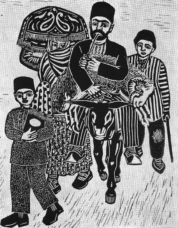 "Gəlin evi üçün qurbanlıq" əsərinə nəzər yetirsək, görərik ki, rəssamın müraciət etdiyi qədim qurban bayramı mərasimi hər zaman öz orijinallığını qorumaqdadır. Kompozisiyada ozamankı geyim tərzinə uyğun hazırlanmış bir ailənin - ər-arvad və iki oğul nişanlı qızın ailəsinə quzu qurbanlığının aparıldığı məqamda təsvir olunub. Evin böyüyü ulaq belində, qucağında quzu və evin xanımı isə başı üzərində buta təsvirli örtüklü xonçanı tutmuş vəziyyətdə təsvir edilib.