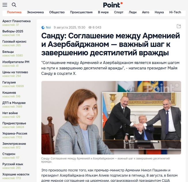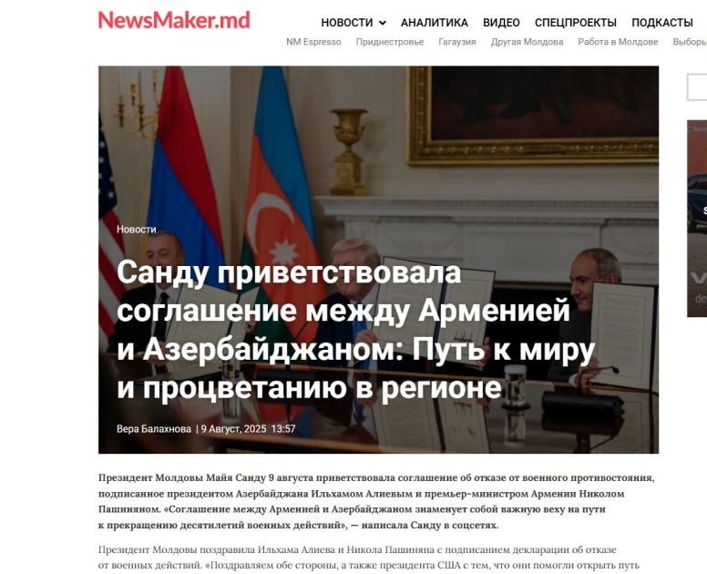 Məqalələrdə, həmçinin Moldova Prezident Maya Sandunun X sosial şəbəkəsində razılaşmaya dəstək fikirləri də yer alıb. Sandu bildirib ki, Ermənistan və Azərbaycan arasında razılaşma onilliklər boyu davam edən düşmənçiliyə son qoymaq yolunda mühüm addımdır. Moldova Prezidenti Bakının və İrəvanın rəhbərlərini, eləcə də Prezident Donald Trampı bölgədə sülhə, barışığa və rifahın yüksəldilməsinə yol açmaqda xidmətlərinə görə təbrik edib.