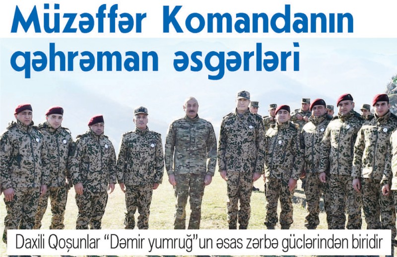 İlham Əliyevin vahid komandanlığı altında Silahlı Qüvvələrimizin tərkibində Daxili Qoşunların hərbi qulluqçuları şərəfli döyüş ənənələrinə sadiq qalaraq, erməni işğalçıları üzərində möhtəşəm qələbənin qazanılmasına öz layiqli töhfələrini verdilər. Ön cəbhənin bütün istiqamətlərində Daxili Qoşunların şəxsi heyəti düşmənə qarşı igidliklə vuruşaraq, torpaqlarımızın azad olunması üzrə döyüş tapşırıqlarını öz canı və qanı bahasına yerinə yetirdi. Hərbi qulluqçularımız yüksək vətənpərvərlik, peşəkarlıq və müasir döyüşaparma qabiliyyəti nümayiş etdirərək, “dəmir yumruq”la erməni işğalçılarının başını əzdilər. Daxili İşlər Nazirliyinin Daxili Qoşunlarının şəxsi heyətindən 66 nəfərin şəhid olması, 346 nəfərin isə yaralanması həm ağrı və kədər, həm də qürurlu, şərəfli salnamədir.