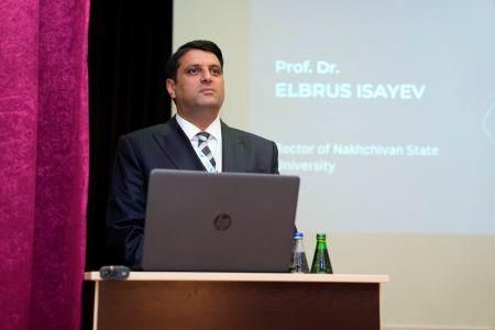 Açılış nitqi ilə çıxış edən NDU-nun rektoru Elbrus İsayev konfransı aktual və müzakirəsi zəruri olan süni intellekt yönündə tədqiqatçıları, sahə mütəxəssislərini, alimləri bir araya toplayan mühüm beynəlxalq forum adlandırıb. Rektor rəhbərlik etdiyi ali təhsil ocağının strateji inkişaf planında kadr potensialının təkmilləşdirilməsində ixtisasları gələcəyin bacarıqları ilə zənginləşdirmək və yeni ixtisaslar açmaq prioritetlərinin olduğunu bildirib. NDU-da ilin əvvəlində robot moderator qadının təqdimatında “Süni intellekt: nəzəriyyədən praktikaya” II Beynəlxalq elmi konfransı keçirildiyini xatırladıb, eləcə də universitetdə tədris olunan ixtisaslarda süni intellektin seçmə fənn olaraq şaxələndirildiyini qeyd edib. Rektor “Naxçıvan Muxtar Respublikasının sosial-iqtisadi inkişafına dair 2023–2027-ci illər üçün Dövlət Proqramı” çərçivəsində Azərbaycan ali təhsil müəssisələri arasında ilk dəfə NDU–da İnnovasiyalar Mərkəzinin açılışına diqqət çəkib və müxtəlif innovativ layihələrin həyata keçirildiyini vurğulayıb. Dünyanın Texnologiya lideri olan IBM-lə NDU arasında əməkdaşlıq müqaviləsinə əsasən istifadəyə verilən IBM Mərkəzi, hazırda tikintisi davam edən Texnologiyalar Parkı haqqında məlumat verib. Rektor irəlidə IBM İnstitutunun, tələbələrin IBM sertifikatı əsaslı təlimlərdə iştirakının, Kulturologiya Mərkəzinin də yaradılmasının planlaşdırılan tədbirlər sırasında olduğunu qeyd edib.