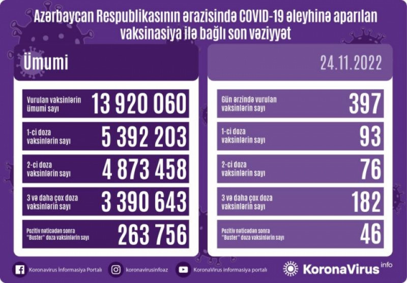 Noyabrın 24-də Azərbaycanda yeni növ koronavirus (COVID-19) infeksiyası əleyhinə 397 doza vaksin vurulub.