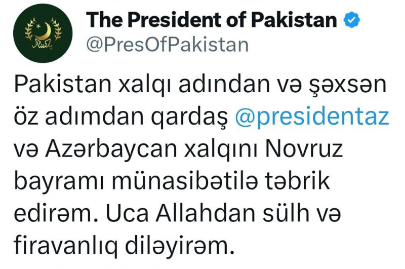 AZƏRTAC xəbər verir ki, Pakistan Prezidenti bununla bağlı rəsmi tviter hesabında paylaşım edib. Paylaşımda qeyd olunub: “Pakistan xalqı adından və şəxsən öz adımdan Azərbaycan Respublikasının Prezidenti qardaş İlham Əliyevi və Azərbaycan xalqını Novruz bayramı münasibətilə təbrik edirəm. Uca Allahdan sülh və firavanlıq diləyirəm”.