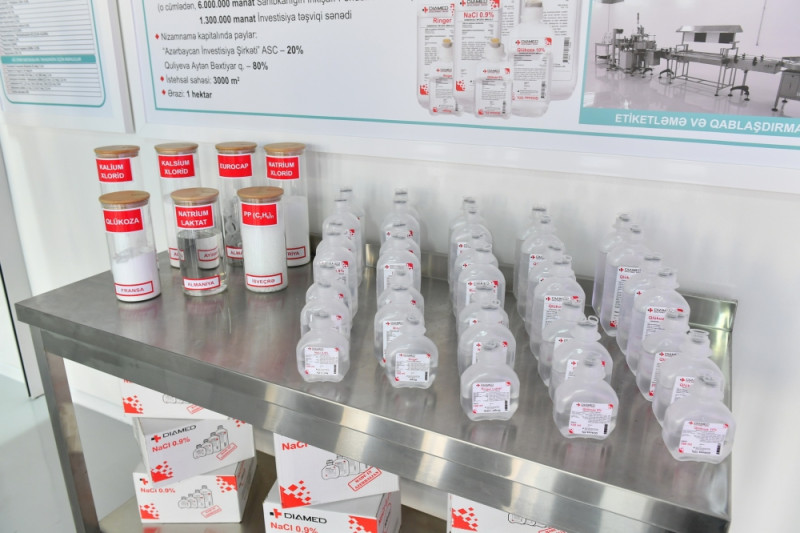 İstehsal prosesi ilə yaxından tanış olan dövlətimizin başçısına məlumat verildi ki, zavodda müxtəlif adlarda, geniş çeşiddə (NaCl 0,9 faiz; Ringer; Ringer laktat; Qlükoza və s.) və müxtəlif həcmlərdə (100 ml, 200 ml, 250 ml, 400 ml, 500 ml) həyati vacib və zəruri venadaxili dərman məhlulları istehsal olunacaq. Müəssisənin illik istehsal gücü 20 milyon litrdir. Qeyd olundu ki, ölkəmizin bu dərmanlara olan illik tələbatı isə təxminən 15 milyon litrdir. Beləliklə, müəssisədə istehsal edilən məhsulların yerli bazarın tələbatını ödəməsi ilə yanaşı, Rusiya, Gürcüstan və Orta Asiya ölkələrinə ixracı da nəzərdə tutulur.