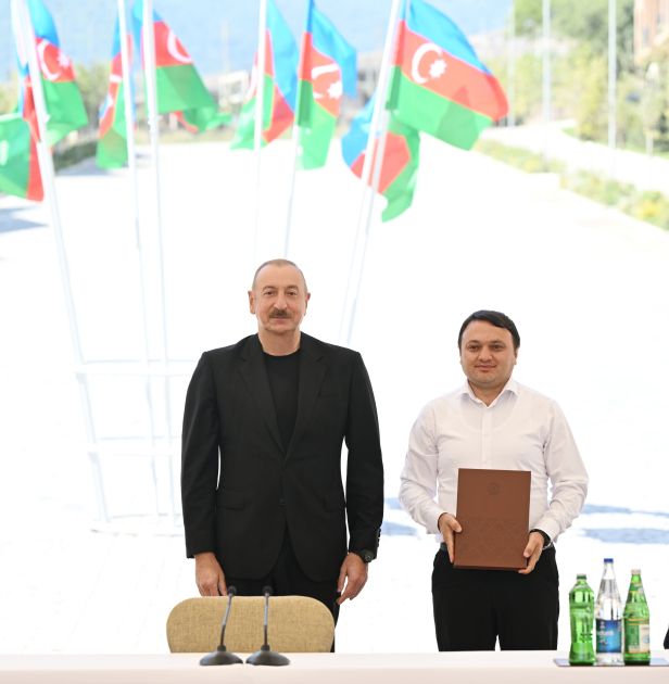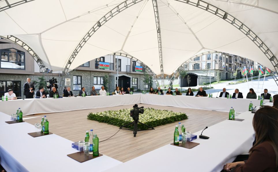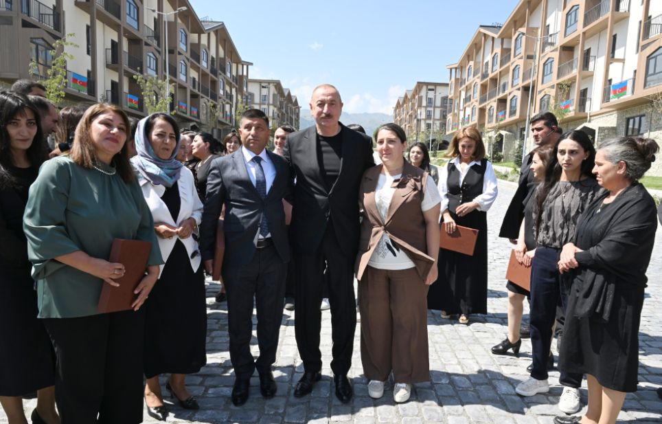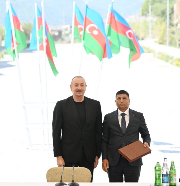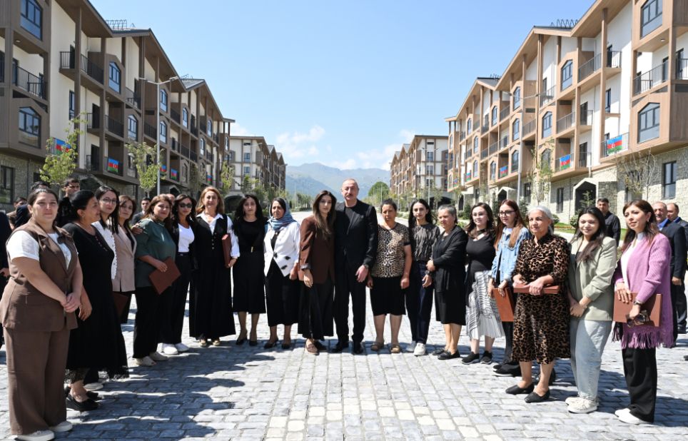 Bizim işimiz quruculuqdur. Onlar bütün şəhər və kəndlərimizi viran qoyublar. Kəlbəcər şəhərində bir dənə salamat bina qalmamışdır. Kəlbəcərin heç bir kəndində bir dənə də bina qalmamışdır. O, vəhşilik idi. O, insanlığa sığmayan hərəkət idi və bunu bir nəfər yox, 10 nəfər yox, kütləvi surətdə edirdilər. Onlar gərək bu məsələlərlə məşğul olsunlar, hansı cəmiyyətdə yaşayır Ermənistan? O cəmiyyət ki, işğal dövründə talançılığı özü üçün əsas gəlir mənbəyi etmişdir. Bu cəmiyyət xəstədir və mən bunu açıq deyirəm. Mən heç kimi təhqir etmək istəmirəm. Biz onlara nə etmişik ki, nə pislik etmişik ki, bu qədər vəhşiliklə üz-üzə qalaq?! Bütün şəhər və kəndlər dağıdılıb, məscidlər dağıdılıb, təhqir edilib, insanlar qətlə yetirilib, öldürülüb, yandırılıb. Hətta İkinci Qarabağ müharibəsindən sonra bizdən vasitəçilər tərəfindən vaxt istəmişdilər, burada öz şələ-şülələrini yığmaq üçün. Biz hətta vaxt da verdik onlara. Nə etdilər? Yandırdılar, ağacları qırdılar. İnsan bunu edər? Axı, bunu təkcə separatçıların başçıları etməyiblər. Kütləvi surətdə ediblər. Yəni, biz bilməliyik ki, kiminlə üz-üzəyik, bizim qonşumuz kimdir. Keçmişimizi heç vaxt unutmamalıyıq və ayıq olmalıyıq. Əminəm ki, bütün bu amillər imkan verəcək ki, üstünlük hər zaman bizdə olsun. Bu gün bunu yenə də deyirəm, biz qalib xalq kimi bəyan edirik. Biz o pisliyi, vəhşiliyi unutmayacağıq. Ancaq biz bundan sonra heç kimlə müharibə aparmaq fikrində deyilik. Əgər bizə qarşı hər hansı bir təhlükə çıxarsa, onda yenə də bizim “dəmir yumruğ”umuzu hər kəs görəcək. Bu gün bu gözəl binaların ətrafında bizim görüşümüz də çox böyük rəmzi məna daşıyır. Onlar buranı dağıdıblar, biz isə qurub-yaratmışıq və sizi bu münasibətlə bir daha təbrik edirəm. Rahat yaşayın, sizə cansağlığı, xoşbəxtlik arzulayıram. Sağ olun.