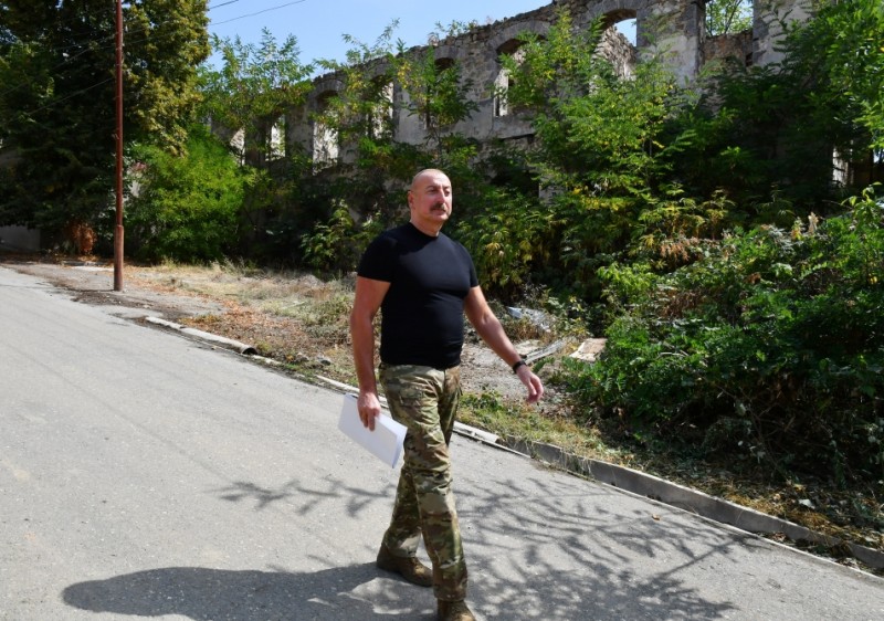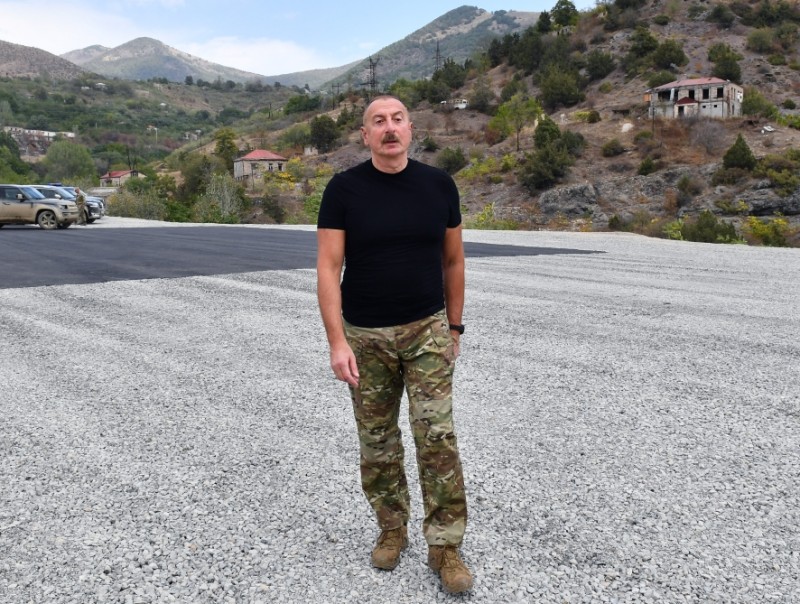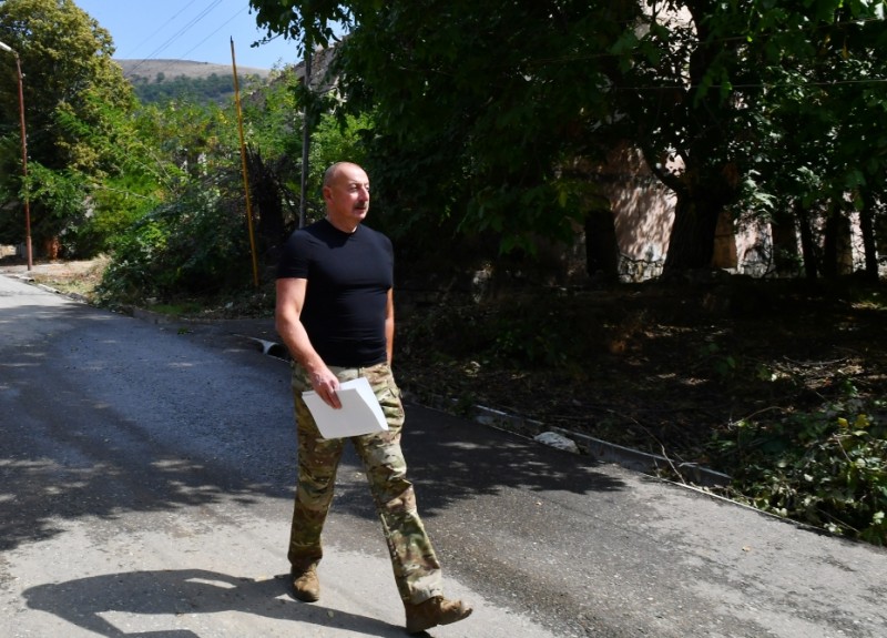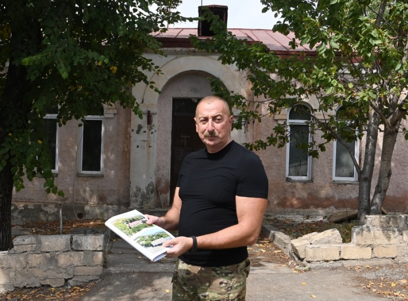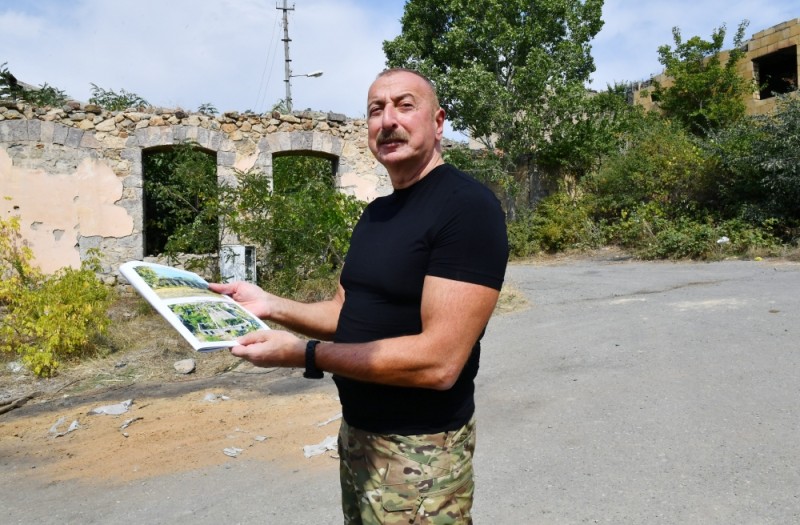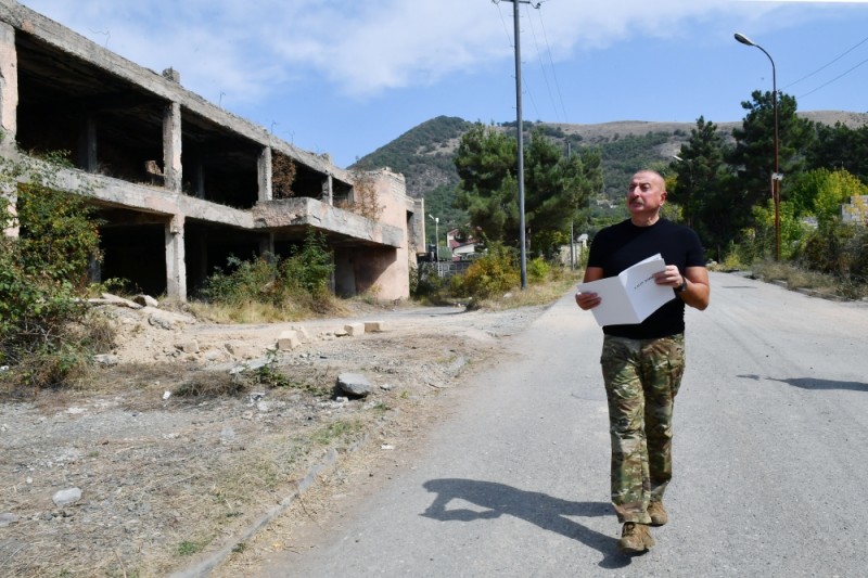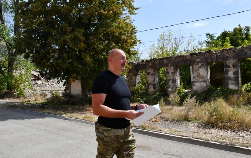 Daha sonra dövlətimizin başçısı Laçın şəhərinin mərkəzi küçəsində ermənilərin törətdikləri dağıntılara baxdı, şəhərin ərazisini seyr etdi.