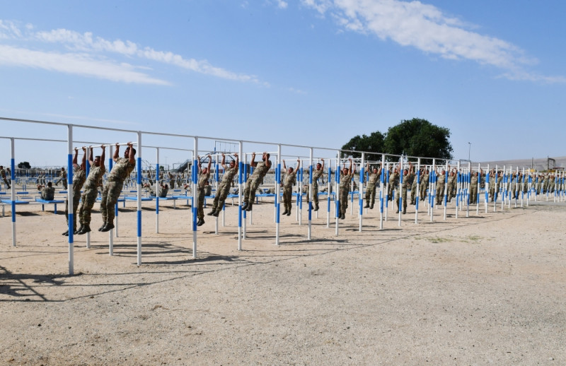 Hərbi hissədəki açıq idman şəhərciyində isə güc məşğələlərinin icrası üçün avadanlıqlar, dözümlülüyün artırılması məqsədilə maneələr zolağı, eləcə də futbol, voleybol, uzunluğa və hündürlüyə tullanma meydançaları yaradılıb. Ali Baş Komandan burada komandoların intensiv hazırlıq məşqlərini izlədi.