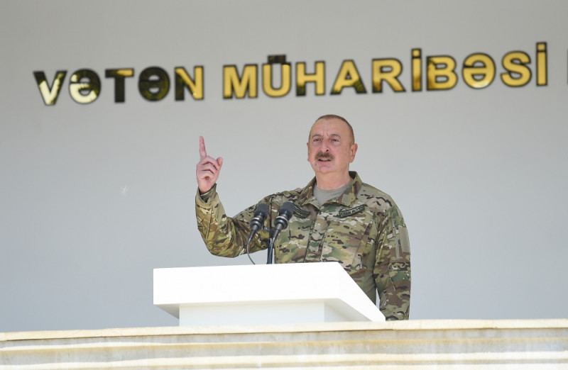Bu gün biz öz şanlı Zəfərimizi siyasi və diplomatik müstəvidə daha da möhkəmləndirdik. Bu gün biz bölgədə söz sahibiyik. Bəziləri, o cümlədən Ermənistan və onun bəzi xarici himayədarları bizi qisasçılıqda ittiham edirlər. Tamamilə yalan bir tezisdir. Mən demişəm və müharibə dövründə demişəm ki, biz düşməndən qisasımızı döyüş meydanında alacağıq, şəhidlərimizin qanını döyüş meydanında alacağıq və belə də oldu. Azərbaycan Ordusu mülki əhaliyə qarşı müharibə aparmamışdır, bunu hər kəs bilir və görür. Ermənistandan fərqli olaraq onların şəhərlərini “İsgəndər”, “Toçka” və “Elbrus” raketləri ilə dağıtmamışıq. Azərbaycan Ordusu yüksək mənəvi xüsusiyyətlərə malikdir, Ali Baş Komandanın əmrlərini tam icra edir və icra edəcək. Ona görə bizi qisasçılıqda ittiham edənlər qoy gedib güzgüyə baxsınlar. Biz qisas yox, ədalət tələb edirik. Biz tələb edirik ki, haqq-ədalət qorunsun. Biz tələb edirik ki, bizim daxili işlərimizə heç kim müdaxilə etməsin. Biz tələb edirik ki, bütün ölkələr sözdə yox, əməldə bizim ərazi bütövlüyümüzə hörmətlə yanaşsın və belə olan halda biz də onların ərazi bütövlüyünə hörmətlə yanaşacağıq. Əks təqdirdə bizim də addımlarımız adekvat olacaq. Yenə də deyirəm, biz qisasımızı döyüş meydanında aldıq. Ancaq bununla bərabər, biz erməni vəhşiliklərini heç vaxt unutmamalıyıq. İşğal dövründə bizim şəhərlərimiz yerlə-yeksan edilmişdir. Tarixi abidələrimiz dağıdılmışdır. Bizim müqəddəs ocaqlarımız təhqir edilmiş və dağıdılmışdır. Bunu edən bizim mənfur qonşularımız idi. Buna göz yuman beynəlxalq aləm, beynəlxalq ictimaiyyət və indi hər gün Ermənistana baş çəkən rüşvətxor Avropa məmurları və deputatlarıdır. Onları bu ədalətsizliyə vadar edən nədir? İkili standartlar və rüşvət! Bunun başqa izahatı ola bilməz. Gedirlər, bizim sərhədimizə yaxın yerlərdə şəkillər çəkdirirlər, bizə hansısa mesajlar ünvanlayırlar. Hünərləri varsa gəlsin yaxınlaşsın bizim sərhədimizə. O vaxtlar artıq tarixdə qaldı. Yenə də onların ayağını biz qırdıq. Çünki İkinci Qarabağ müharibəsindən sonra biz bunu unutmamışıq. Bəzi Avropa ölkələrinin rəsmi nümayəndələri bizim ərazimizə, Xankəndiyə icazəsiz soxulmuşdular. Mən o vaxt demişdim ki, əgər bizim bundan xəbərimiz olsaydı, onları buraxmayacaqdıq. Bu gün də deyirəm, hünəriniz varsa gəlin, görək sonra axırınız nə olacaq?