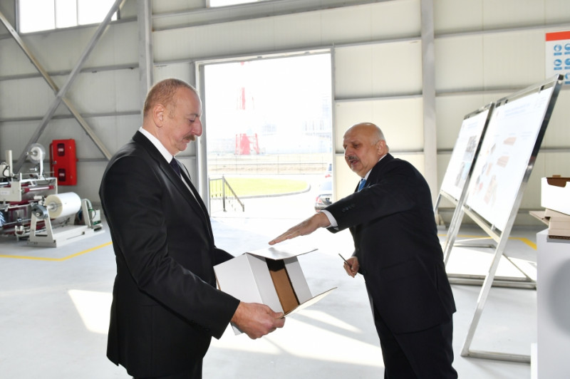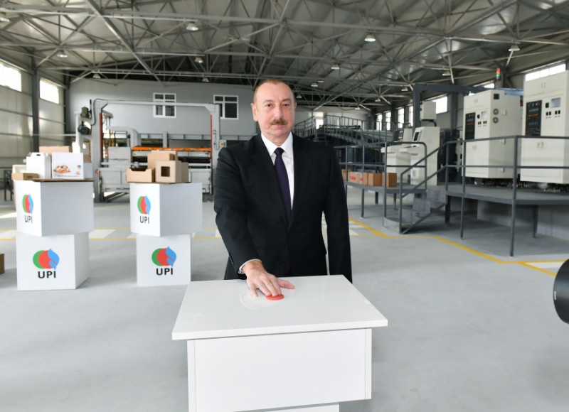 Sonra Prezident İlham Əliyev “Universal Qablaşdırma Sənaye” Qapalı Səhmdar Cəmiyyətinin Qablaşdırma məhsulları istehsalı müəssisəsinin açılışında iştirak etdi.