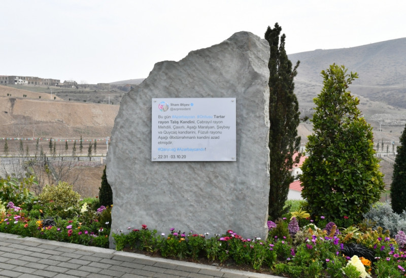 Qeyd edək ki, Azərbaycan Respublikasının Prezidenti, Silahlı Qüvvələrin Müzəffər Ali Baş Komandanı İlham Əliyevin rəhbərliyi ilə rəşadətli Azərbaycan Ordusu 2020-ci il oktyabrın 3-də bu strateji ərazini düşməndən azad edib. Talış kəndində yüksək nöqtələrdən birində bu ərazinin işğaldan azad olunduğu gün Müzəffər Ali Baş Komandan tərəfindən paylaşılan tvitin mətninin həkk olunduğu Xatirə daşı yerləşdirilib.