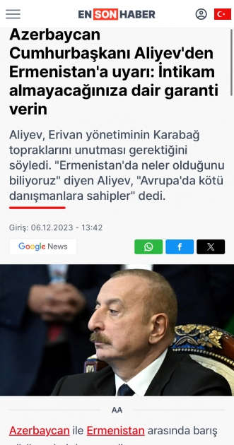 “Haber 16” saytı isə “Əliyev: Sülh müqaviləsinin prinsipləri tərtib edilib Ermənistana göndərilib” başlıqlı yazıda Prezident İlham Əliyevin çıxışından belə bir sitat gətirib: “Beş məlum prinsip açıqlandı. İndi görünür ki, Ermənistan bunları qəbul etməyə yaxındır. Onlar bunu baza kimi götürə bilərlər. Bunu bir neçə il əvvəl etsəydilər, əlbəttə ki, antiterror əməliyyatına ehtiyac qalmazdı. Bu, tarixdir və onu göstərir ki, sülhü təşviq edən tərəf məhz Azərbaycan idi, Ermənistan deyil”.