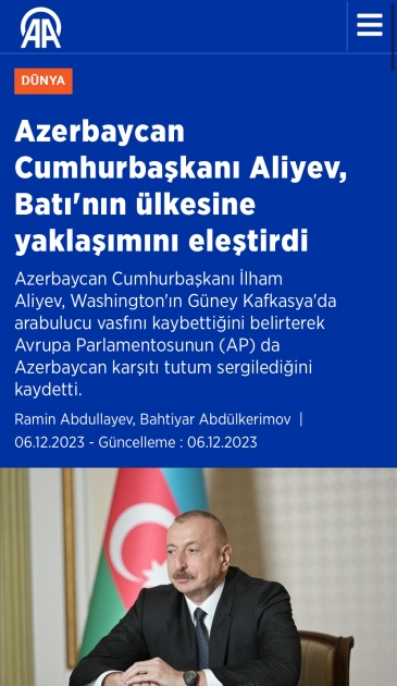 “Hurriyet.com” saytının “Sülh anlaşmasının əsas maddələri hazırlanıb Ermənistana göndərildi” sərlövhəli yazısında da Prezident İlham Əliyevin fikirləri əks olunub. Yazıda dövlətimizin başçısının fikirlərinə istinadla bildirilib ki, Azərbaycan iki il yarım bundan əvvəl suverenliyini bərpa etdikdə, Qarabağda böyük həcmdə çoxsaylı erməni kontingenti vardı və onlar heç bir beynəlxalq hüququn prinsiplərinə məhəl qoymurdular. Daha sonra Prezident İlham Əliyevin bu fikirlərindən sitat gətirilib: “Biz ümid edirdik ki, bu məsələ öz həllini tapacaq. Biz dərk edirdik ki, bu, anormal vəziyyətdir və İkinci Qarabağ müharibəsi bitəndən sonra bizim mövqeyimiz aydın idi. Qarabağda yaşayan insanların iki seçimi var - onlar ya Azərbaycan vətəndaşları olurlar və onların bütün hüquqi çərçivələri yaradılır və ya yaşayış üçün digər yerləri seçirlər. Bunun başqa yolu yox idi”.