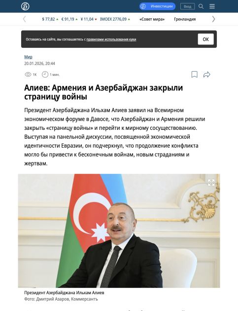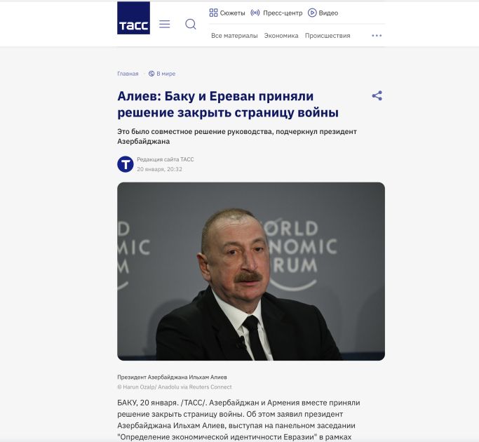 Türkiyənin “Anadolu“, “İhlas“ xəbər agentlikləri, Rusiyanın “Kommersant“, “Komsomolskaya pravda“, “Vedomosti“, “Vesti“, “Qazeta“ qəzet və portalları, “TASS“ xəbər agentliyi, ərəbdilli “lebanon24“, “Al bayader“ portalları” Prezident İlham Əliyevin çıxışına istinadla Azərbaycanın və Ermənistanın müharibə fəslini bağladığını qeyd ediblər. Dövlətimizin başçısı qeyd edib ki, otuz il əziyyət çəkmiş ölkənin lideri olaraq lazımi vaxtda dayanmaq olduqca məsuliyyətli və vacib qərar idi. Sonsuz müharibələr daha çox əziyyət və qurbanlar ilə nəticələnəcəkdi. “Beləliklə, müharibə heç vaxt bitməyəcəkdi. Kimsə bunu dayandırmalı idi və biz buna son qoymaq qərarına gəldik. Bəli, həmin fəsli bağlamaq və sülh üçün imkanları görməklə bağlı qərar Azərbaycan və Ermənistan liderlərinin birgə qərarı idi”, - deyə Azərbaycan Prezidenti vurğulayıb.