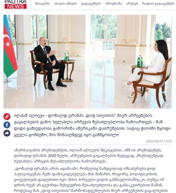 Gürcüstanın nüfuzlu “interpressnews.ge”, “palitranews.ge”, “aktual.ge”, “resonancedaily.com”, “24news.ge” informasiya portalları və “1tv.ge” televiziya kanalı Azərbaycan Prezidentinin müsahibəsindən materiallar hazırlayıb. Materiallarda Azərbaycan Prezidenti İlham Əliyevin ABŞ Prezidenti Donald Trampın siyasi kursu, sülh siyasəti, “dərin dövlət”in fəaliyyəti, Zəngəzur dəhlizi, İran Prezidentinin açıqlamaları, eləcə də Azərbaycana aid təyyarənin vurulması ilə bağlı fikirləri geniş yer alıb.