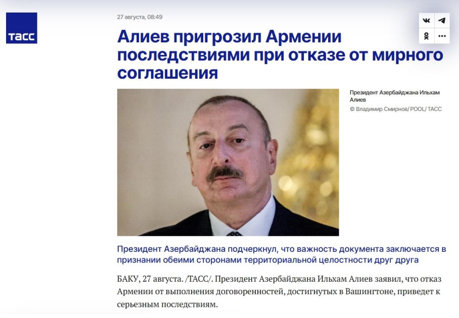 Rusiyanın TASS agentliyi Prezident İlham Əliyevin Azərbaycan ilə Ermənistan arasında razılığın əldə olunması və Zəngəzur dəhlizinin əhəmiyyəti barədə fikirlərinə yer verib. Məqalələrdə dövlətimizin başçısının Ermənistan ilə Azərbaycan arasında Vaşinqtonda əldə olunan razılaşmanın hər iki tərəf üçün ərazi bütövlüyünün tanınması baxımından əhəmiyyəti vurğulanıb. Dövlətimizin başçısının Ermənistanın razılaşmalardan imtina edəcəyi təqdirdə bunun ciddi nəticələri olacağı və Azərbaycan buna müvafiq cavab verəcəyini qeyd etməsi xüsusi vurğulanıb. Həmçinin Azərbaycan Prezidentinin Zəngəzur dəhlizinin potensial imkanları, yeni marşrutun Şimal–Cənub istiqamətində region ölkələri üçün faydalı olacağı, həm Azərbaycan, həm Rusiya, həm də İranın bu layihədən yararlana biləcəyi barədə fikirləri diqqətə çatdırılıb.