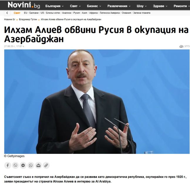 Bolqarıstanın ən böyük onlayn xəbər portalı olan “Novini”, eləcə də “Blitz”, “Actualno” nəşrləri dövlətimizin başçısının Azərbaycan-Rusiya münasibətləri, AZAL təyyarəsinin vurulması ilə bağlı fikirlərinə yer verib. Prezident İlham Əliyevin Rusiya ordusunun 1920-ci ildə Azərbaycanı işğal etməsi ilə Azərbaycan Xalq Cümhuriyyətinin süqut etməsi, tarixi ərazilərimiz olan Qərbi Zəngəzurun Ermənistana verilməsi ilə Azərbaycanın iki yerə bölündüyü qeyd olunub.