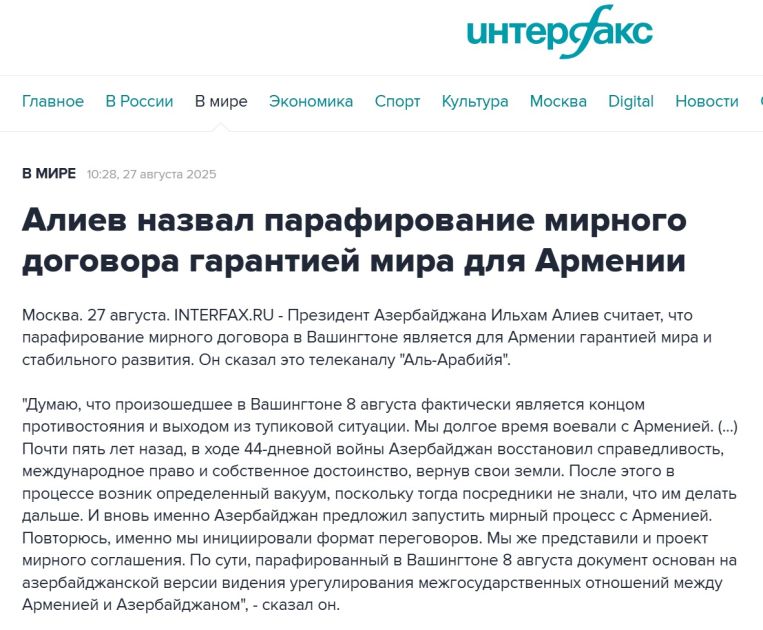 “InterFax” agentliyində yayımlanan xəbərlərdə isə Prezident İlham Əliyevin ABŞ Prezidenti Donald Trampın dəstəyi ilə Azərbaycan ilə Ermənistan arasında sülh müqaviləsinin paraflanmasının əhəmiyyəti və Vaşinqton görüşünün müharibənin sonu olması və eyni zamanda, bunun Cənubi Qafqaz, Mərkəzi Asiya və Yaxın Şərq regionu üçün tamamilə yeni imkanlar açması barədə açıqlaması diqqətə çatdırılıb. Bundan başqa, Prezident İlham Əliyevin Azərbaycan ilə Rusiya arasında münasibətlərin pisləşməsinə görə Rusiyanın məsuliyyət daşıdığını qeyd etdiyi bildirilib. Bu kontekstdə AZAL təyyarəsinin vurulması, Rusiyada azərbaycanlılara qarşı səbəbsiz hücumların baş verdiyi, Azərbaycanın isə konstruktiv və qanuni şəkildə hərəkət etdiyi barədə fikirləri qeyd olunub.