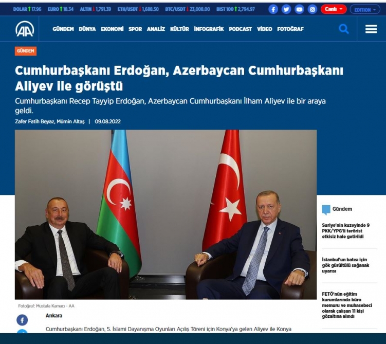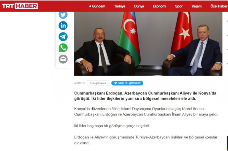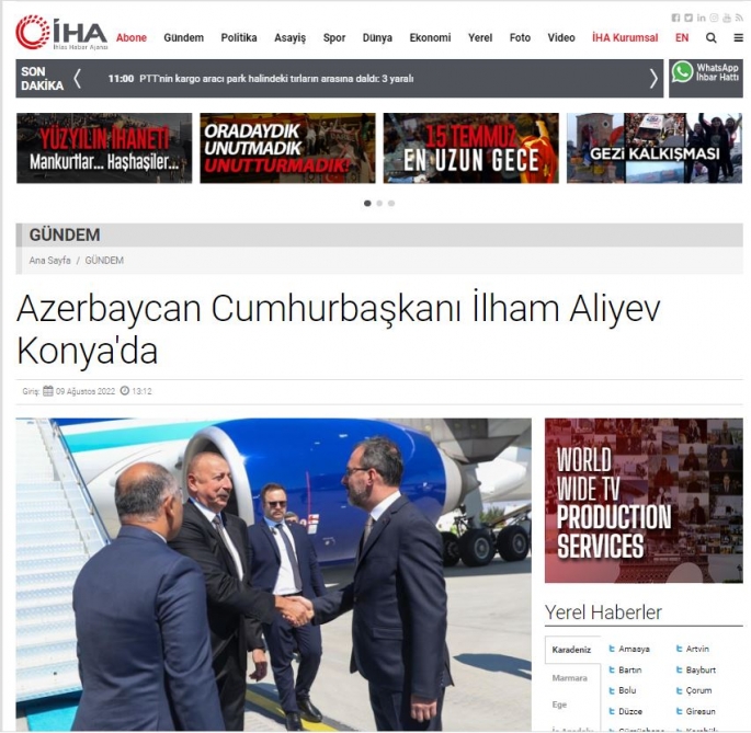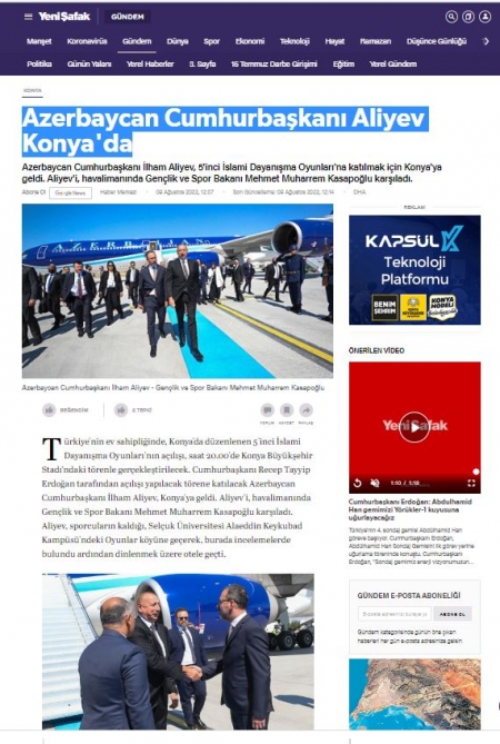 Azərbaycan Prezidenti İlham Əliyevin Türkiyə Prezidenti Rəcəb Tayyib Ərdoğanın dəvəti ilə avqustun 9-da Konya şəhərinə işgüzar səfəri qardaş ölkənin aparıcı kütləvi informasiya vasitələri tərəfindən geniş işıqlandırılıb.