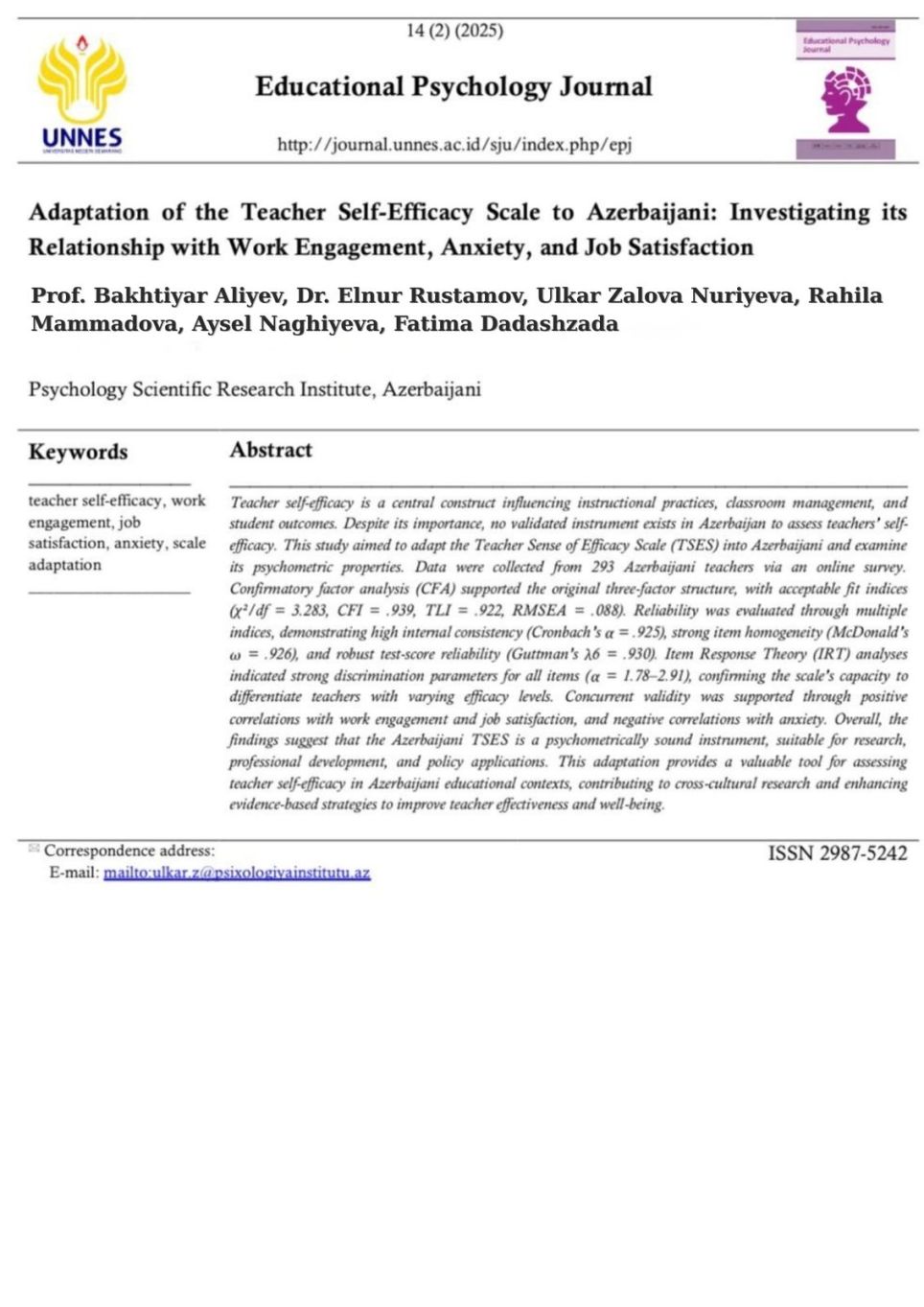 Psixologiya Elmi-Tədqiqat İnstitutu tərəfindən həyata keçirilən fundamental elmi tədqiqatın nəticələri nüfuzlu beynəlxalq indeksli “Educational Psychology Journal” jurnalında dərc olunub. Sözügedən jurnal WorldCat, Google Scholar, ROAD və Crossref kimi aparıcı beynəlxalq elmi bazalarda indekslənir.