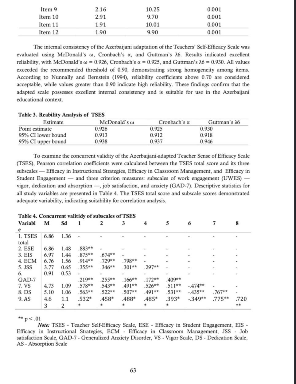 Tədqiqatda 293 müəllim (266 qadın, 27 kişi) iştirak etmişdir. Nəticələr göstərmişdir ki, özyetərlilik səviyyəsi yüksək olan müəllimlərdə təşviş göstəriciləri əhəmiyyətli dərəcədə aşağıdır. Eyni zamanda, yüksək özyetərlilik iş məmnuniyyəti və işə cəlbolunmanın artması ilə müşayiət olunur. Bu faktlar müəllim özyetərliliyinin psixoloji rifah üçün qoruyucu faktor rolunu təsdiqləyir.