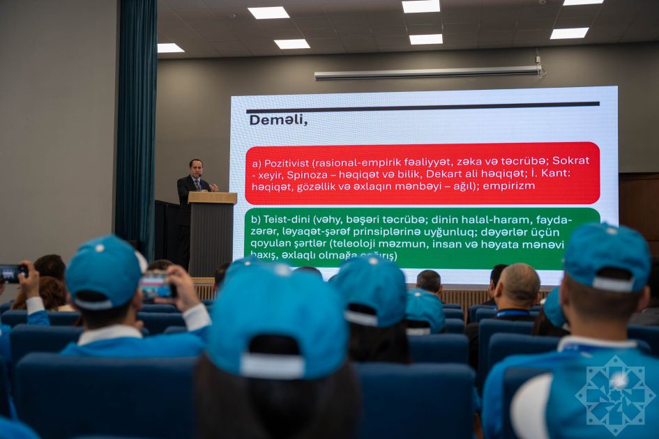Azərbaycan İlahiyyat İnstitutunun müəllimi, fəlsəfə üzrə fəlsəfə doktoru dosent Elvüsal Məmmədov isə “Mənəvi dəyərlər: fərdi və sosial həyatda əhəmiyyəti və funksiyaları” mövzusunda mühazirə ilə çıxış edib. Məruzədə fərdi inkişafda mənəvi prinsiplərin rolu və onların cəmiyyət həyatında təsirləri təhlil olunub.